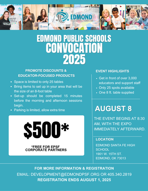 The Edmond Public Schools Convocation event is on August 8th, 2025 beginning at 8:30 am, with the Expo immediately afterward. At this event, you have the opportunity to provide information about your company or services to potentially 3,000 EPS educators and support staff to promote discounts and educator-focused products.
